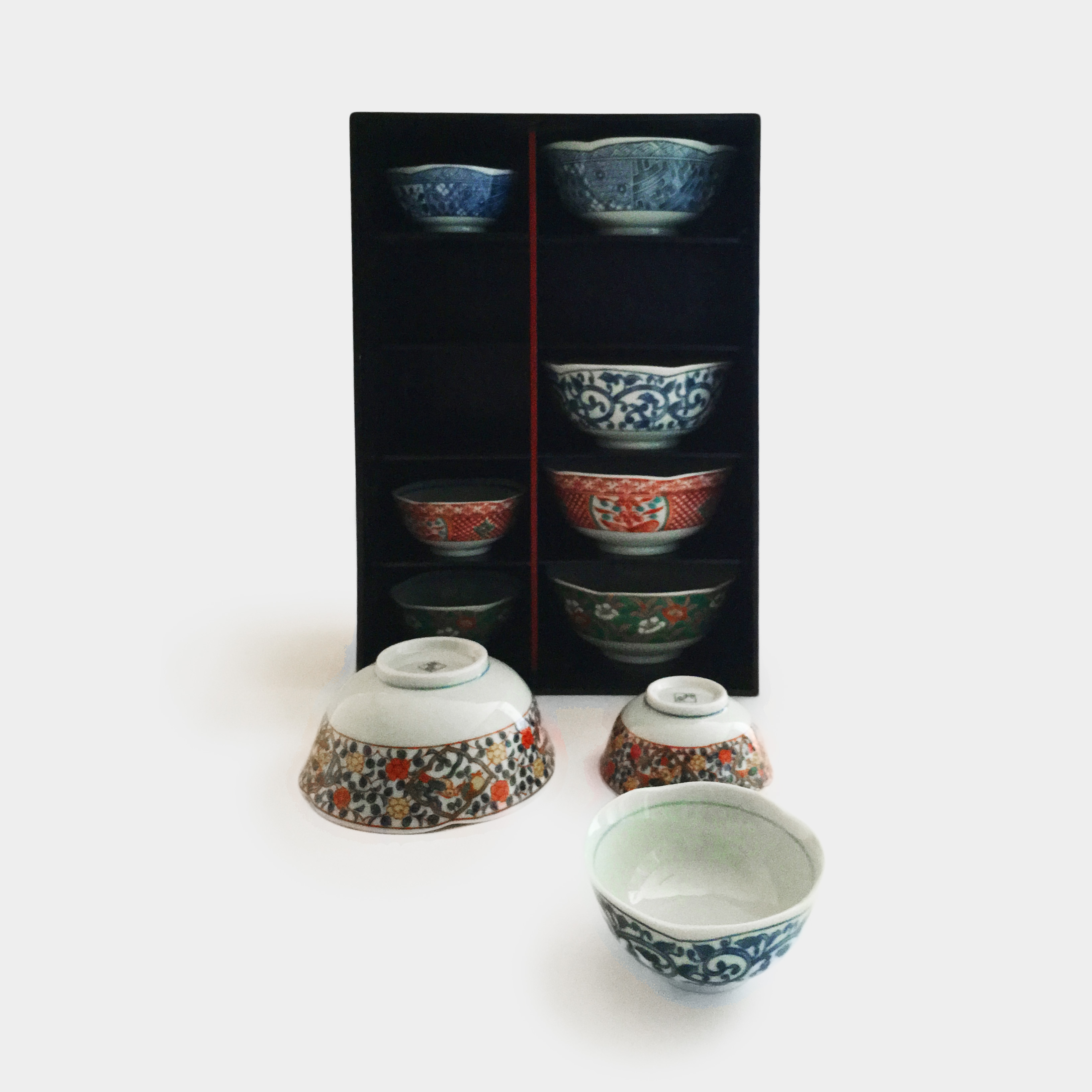 Sada deseti misek dvou velikostí v dřevěném stojanu