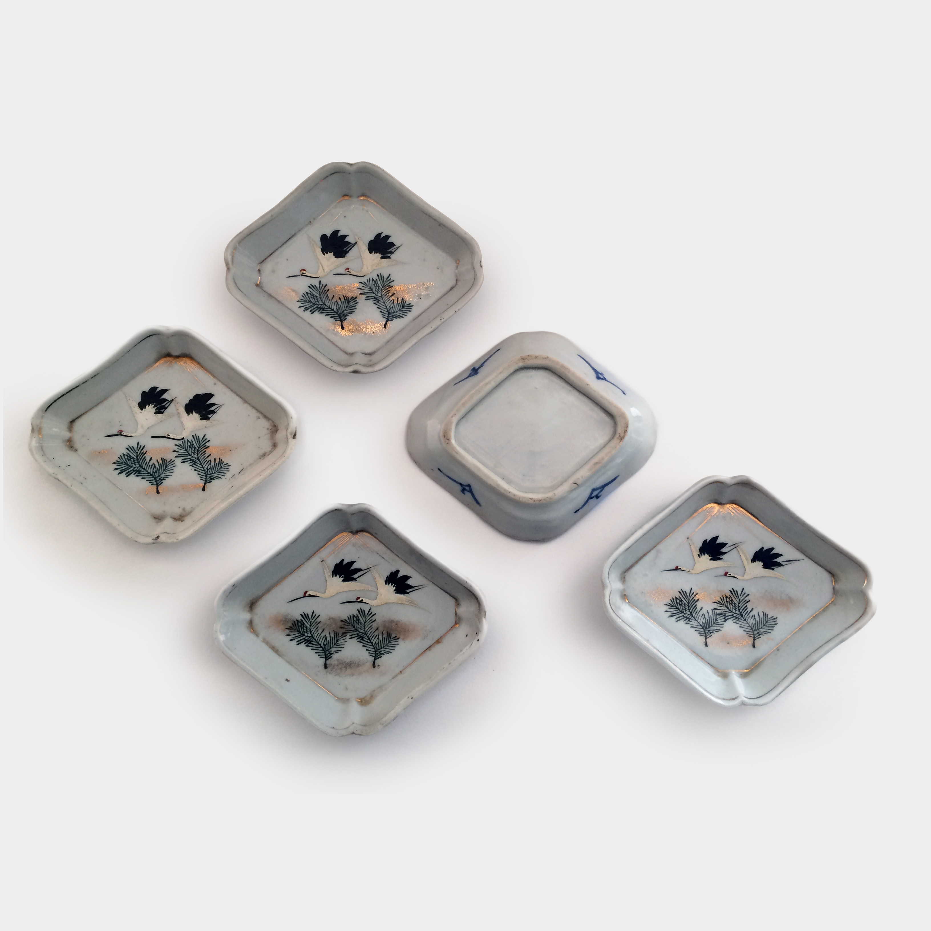 Sada pěti talířů s jeřáby a borovicemi